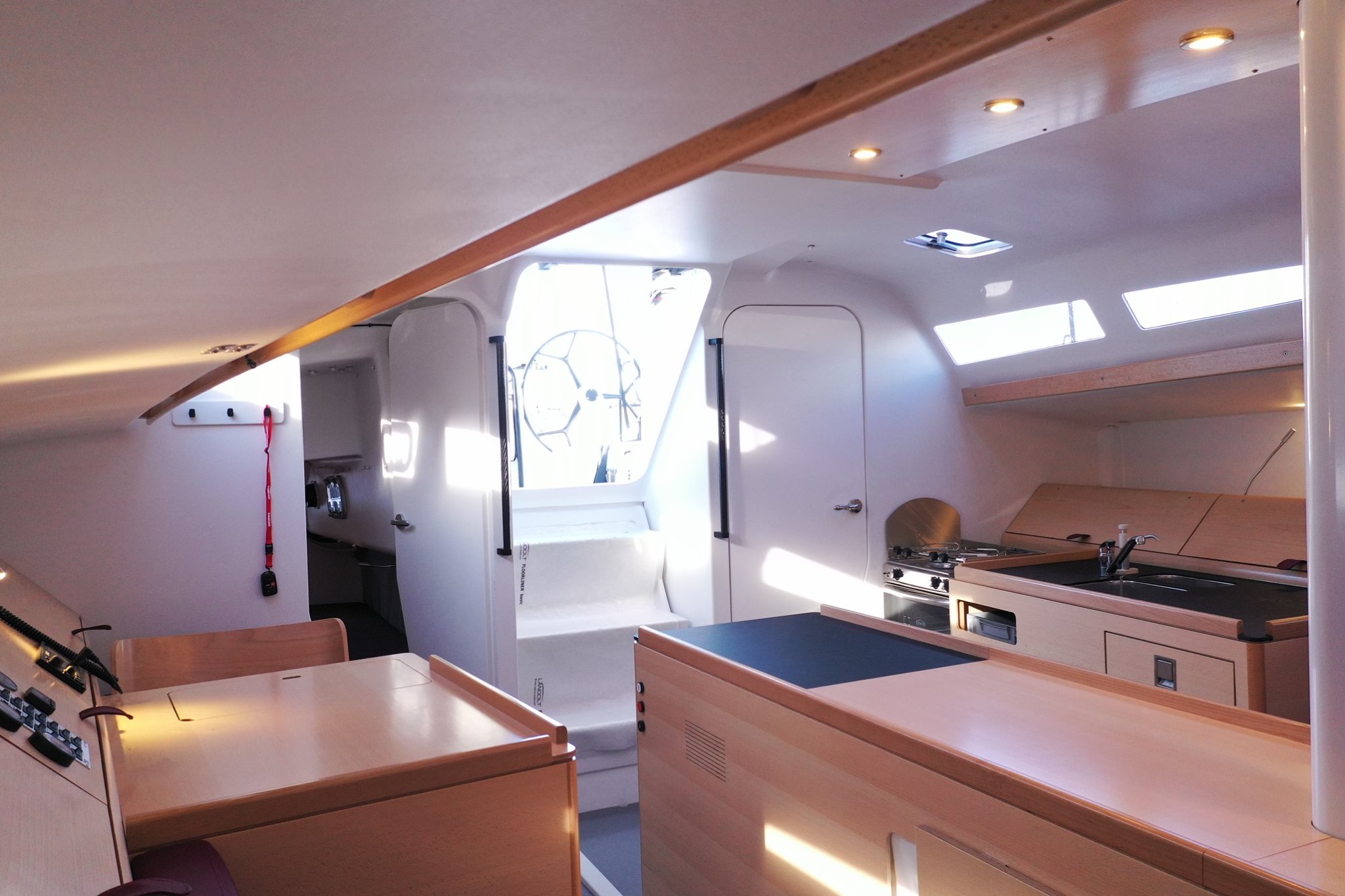 Though she has race performance, the Pogo 12.50 was built with comfort in mind. The space of the interior and exterior are what you expect to find on much larger yachts. The interior has an island in the middle, with couches on either side for relaxing, and a generous galley. There are two stern cabins, one forward cabin, and one head (shower/toilet). The exterior has a large cockpit, swimming platform and cockpit shower. There is no permanently fixed table in the cockpit area to allow easier handling and movement when sailing.
